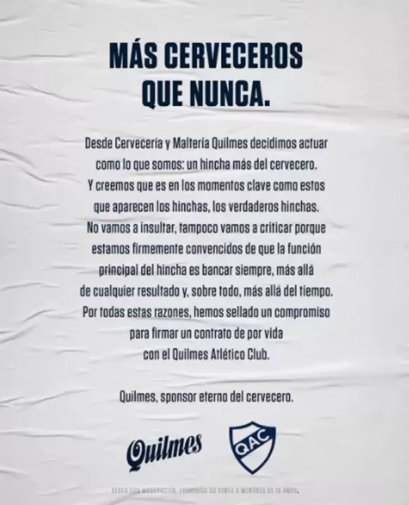 Allí, se destacó la fidelidad del acuerdo más allá de la categoría en la cual juegue el equipo que hace algunos años no ha logrado levantar vuelo desde lo deportivo. "No vamos a insultar, tampoco vamos a criticar porque estamos firmemente convencidos que la función principal del hincha es bancar siempre, más allá de cualquier resultado y, sobre todo, más allá del tiempo", anunció el club no sin antes concluir con un "Quilmes, sponsor eterno del Cervecero".