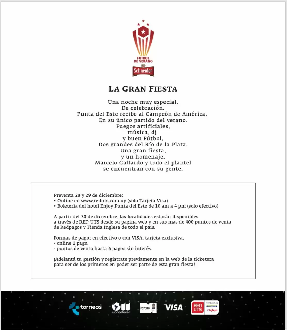Bajo el nombre de: “La gran fiesta”, el encuentro organizado por World Eleven, con Guillermo Tofoni a la cabeza, contará con una propuesta única desde las 22.10. “Una noche muy especial, de celebración. Punta del Este recibe al campeón de América, en su único partido del verano. Fuegos artificiales, música, DJ y buen fútbol. Dos grandes del Río de La Plata. Una gran fiesta y un homenaje: Marcelo Gallardo y todo el plantel se encuentran con su gente”.
