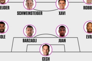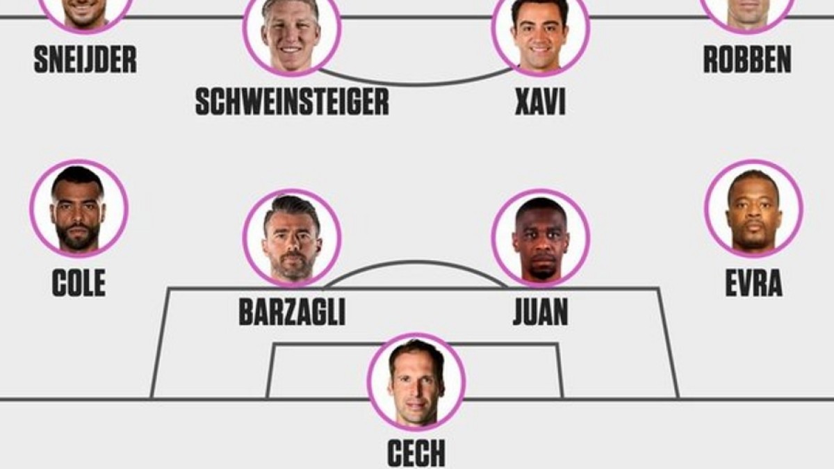 No te pierdas el equipo completo a continuación: Petr Cech; Patrice Evra, Juan, Andrea Barzagli, Ashley Cole; Arjen Robben, Xavi Hernández, Bastian Schweinsteiger, Wesley Sneijder; Fernando Torres y Samuel Eto’o.