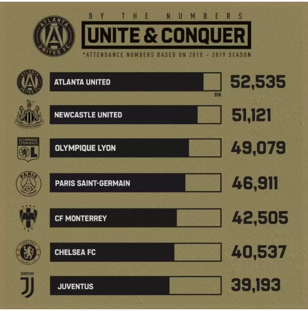 A través de sus redes sociales oficiales, el Atlanta United de la MLS compartió un cuadro actualizado con el promedio de asistencia por partido en cada estadio del mundo, en donde curiosamente lideran ampliamente.