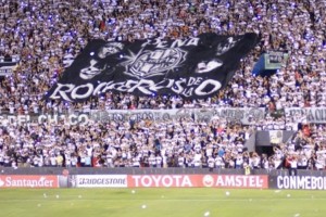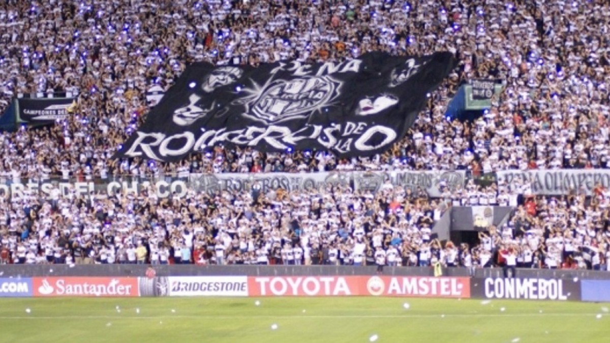 Los hinchas de Olimpia desplegaron una bandera con la imagen de Paul Stanley, Peter Criss, Ace Frehley y Gene Simmoms, los miembros de la banda de rock Kiss, en el partido ante Sol de América en el estadio Manuel Ferreira.