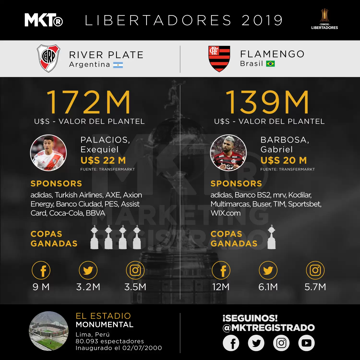 Te invitamos a analizar a los dos equipos al estilo Marketing Registrado para conocer y comparar valores de mercado de los planteles, los sponsors que trabajan con los clubes y los números de las redes sociales.