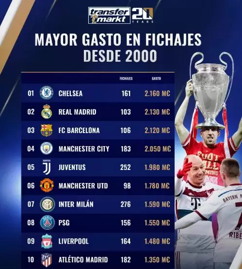 El club inglés incluso superó al poderoso Real Madrid, que suele caracterizarse por hacer fichajes extravagantes. El equipo de la capital española realizó 103 fichajes desde el año 2000 hasta hoy e invirtió 2.130 millones de euros.