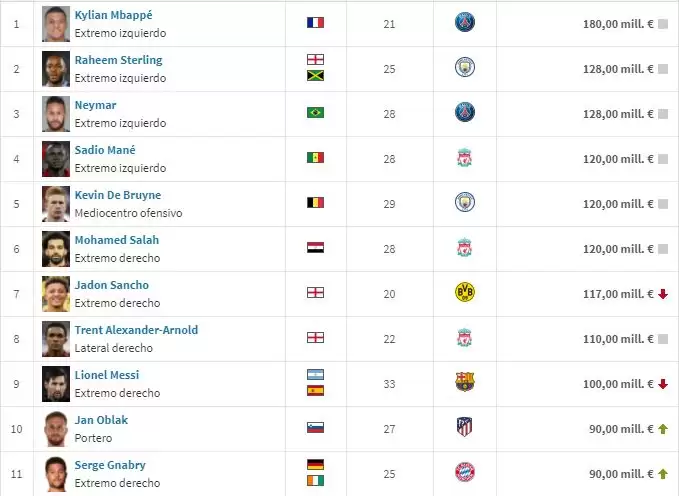 El resto del “Top Ten” está conformado por: Jadon Sancho (Borussia Dortmund – 117 millones), Trent Alexander-Arnold (Liverpool – 110 millones), Lionel Messi (Barcelona – 100 millones), Jan Oblak (Atlético de Madrid – 90 millones) y Serge Gnabry (Bayern Múnich – 90 millones).