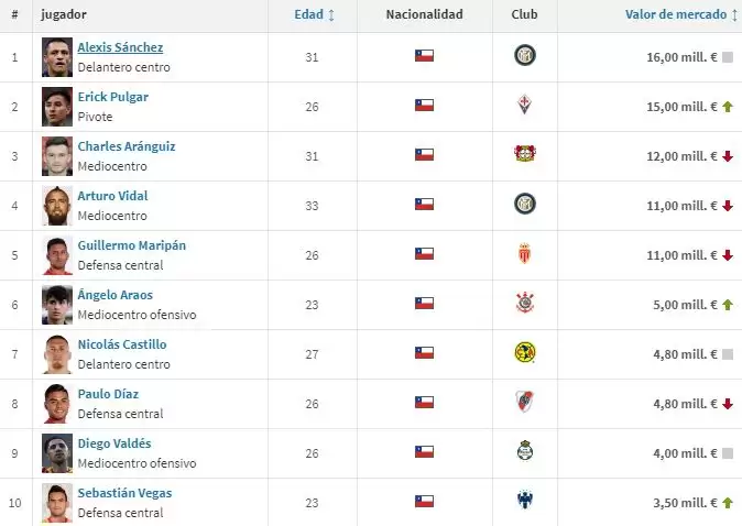 El primero de la lista es Alexis Sánchez con un valor de 16 millones de euros. El delantero del Inter, con pasos anteriores por el Barcelona, Arsenal y Manchester United. En el fútbol de Sudamérica defendió los colores de Cobreloa, Colo-Colo y River. Con el equipo nacional ganó las ediciones de la Copa América 2015 y 2016.