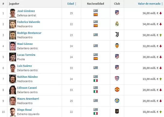 Con 32 millones se ubica Maximiliano Gómez del Valencia, en el cuarto lugar. Lucas Torreira, defensa de Atlético de Madrid valorado en 30 millones, ocupa la quinta posición.