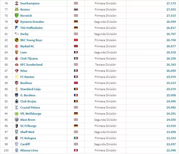 Alianza Lima, en el puesto 100, completa el ranking. El equipo peruano lleva un promedio de 22.946 espectadores por fecha al estadio Alejandro Villanueva.