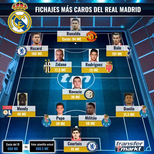 Transfermarkt, sitio especializado en valoración de jugadores y plantillas, realizó una formación a partir de los fichajes más caros hechos por el Real Madrid a lo largo de la historia del club.