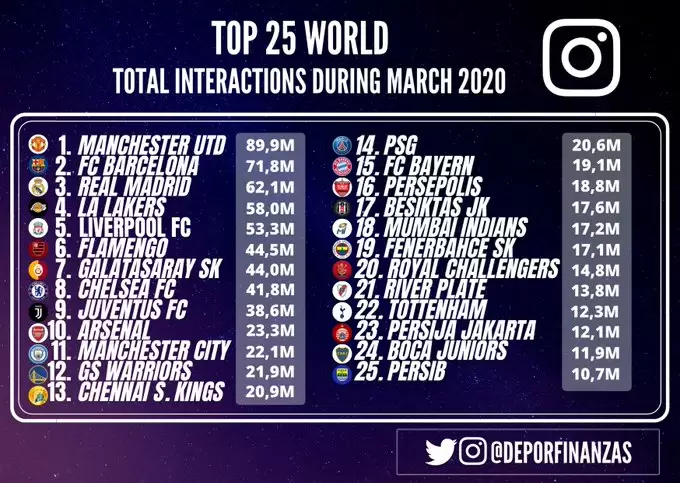 El sitio Deportes & Finanzas justamente llevó a cabo un análisis de cuáles fueron los 25 equipos deportivos que más interacciones lograron en sus cuentas de Instagram durante el mes de marzo de 2020. En el ranking se pueden observar tanto equipos de fútbol de Europa y Sudamérica, como equipos de básquet y de cricket.
