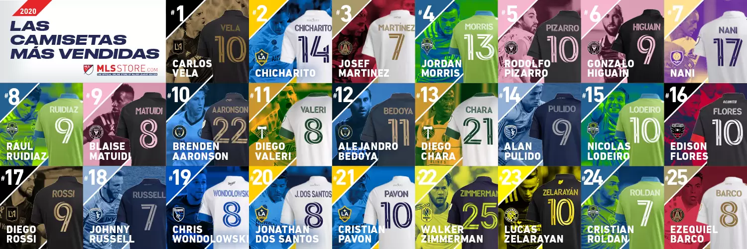 El mexicano Carlos Vela, de Los Angeles Football Club, encabeza la lista de ventas. En segundo lugar quedó “Chicharito” Hernández de Los Angeles Galaxy. Mientras que el último escalón del podio lo completa Josef Martínez, el jugador venezolano que se destaca en el Atlanta United.