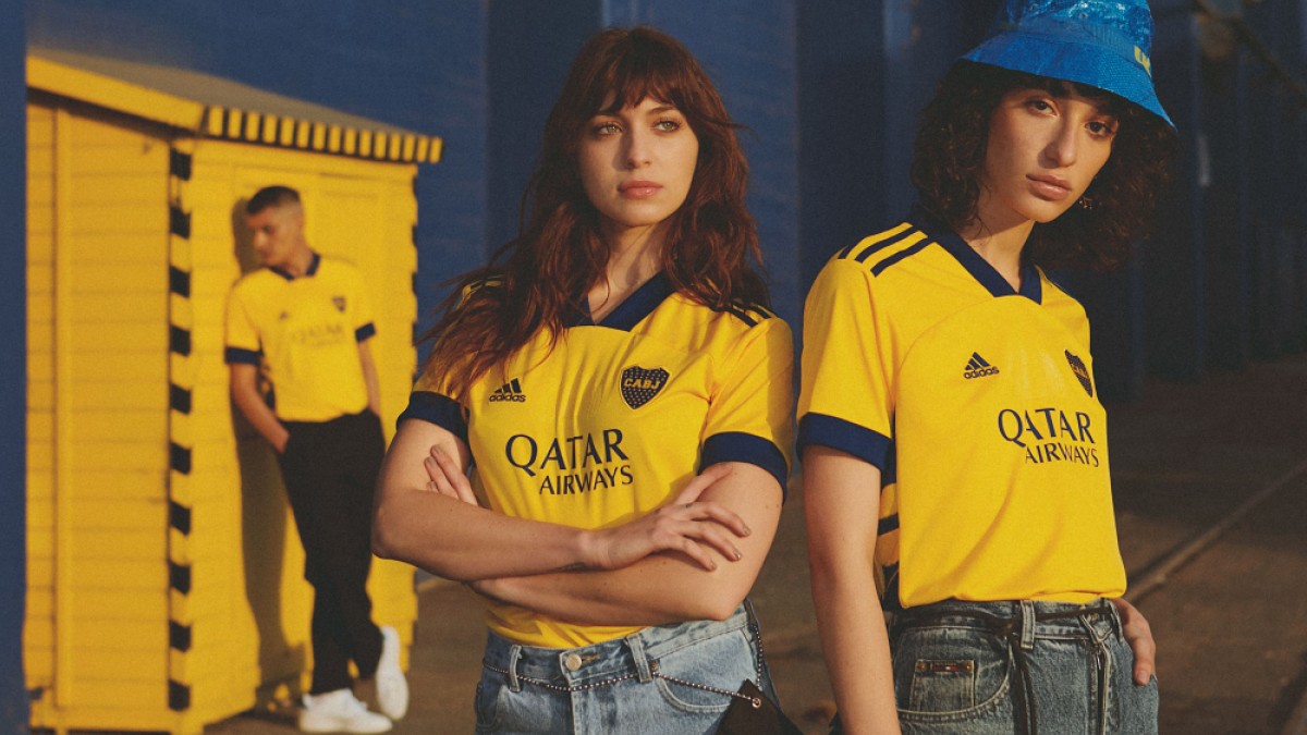 La camiseta tiene un color amarillo de base y en el pecho se aprecia una imagen aérea de La Bombonera en bajo relieve. Los laterales, por su parte, hacen alusión a las emblemáticas escaleras de la cancha. El cuello y las mangas son de color azul y el conjunto se completa con pantalón y medias también de color amarillo.
