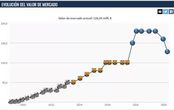 En el momento que comenzó a jugar en Francia, su cotización volvió a elevarse llegando a los 150 millones. Su tope máximo fue de 180 millones de euros entre 2018 y 2019. A partir de allí, por primera vez en su carrera, comenzó a decaer. Primero a 160 millones y luego a los actuales 128 millones de euros.