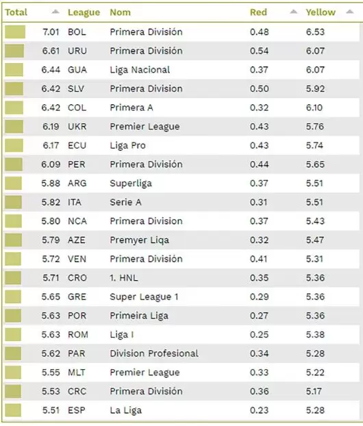 Bolivia ocupa la primera posición con 7,01 tarjetas por partido (0,48 rojas y 6,53 amarillas), lo sigue Uruguay con 6,61 tarjetas por partido (0,54 expulsiones contra 6,07 de amonestaciones) y Guatemala completa el podio con un promedio de 6,44 tarjetas (0,37 y 6,07).