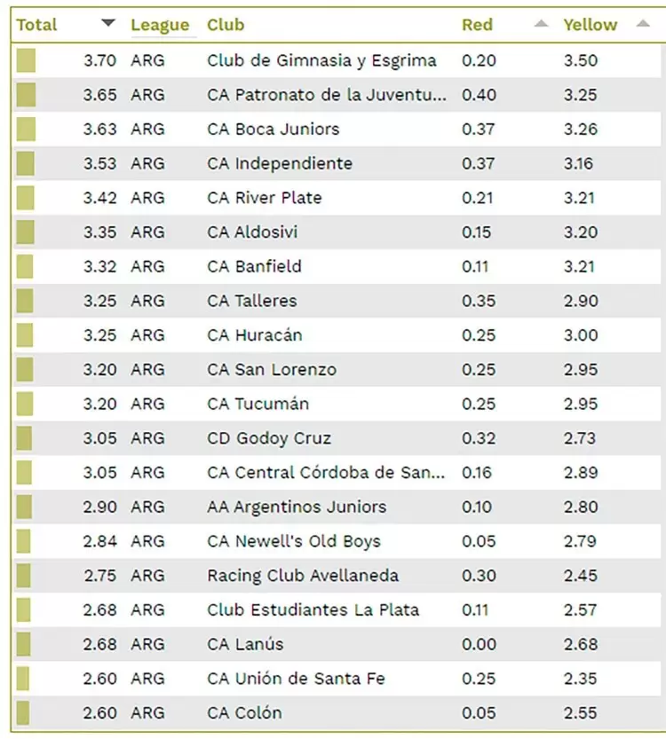 En cuanto a la Superliga Argentina, es Gimnasia y Esgrima La Plata el que más tarjetas recibe por partido con un promedio de 3,7 tarjetas por partido (0,2 rojas y 3,5 amarillas). Al equipo dirigido por Maradona lo siguen Patronato, Boca Juniors, Independiente y River Plate.
