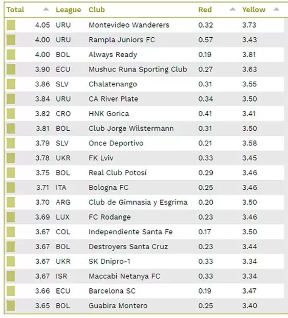En cuanto a lo que tiene que ver con los clubes. El relevamiento determinó que los dos equipos más violentos del fútbol son uruguayos. Montevideo Wanderers (4,05) y Rampla Juniors (4), que tiene el mismo promedio que Always Ready de Bolivia pero con más expulsiones, son los líderes de este ranking.