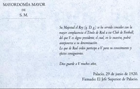 "Su Majestad el Rey se ha servido conceder con la mayor complacencia el Título de "Real" a ese Club de Football del que V. es digno presidente, el cual, en lo sucesivo, podrá anteponerse a su denominación. Lo que de Real orden participo a V. para su conocimiento y efectos consiguientes. Dios guarde a V. muchos años", puede leerse en la carta entregada al club y la cual permitía cambiar el nombre a Real Madrid Football Club.