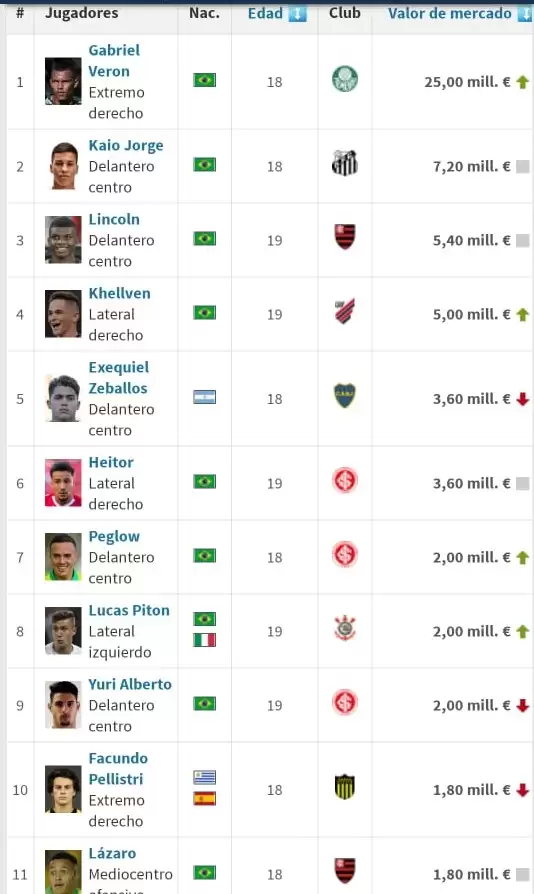 En segundo lugar, es muy remarcada la diferencia de valor entre el líder del ranking con el resto. Gabriel Veron, delantero de Palmeiras, está cotizado en 25 millones de euros, triplicando el valor de su perseguidor, Kalo Jorge.