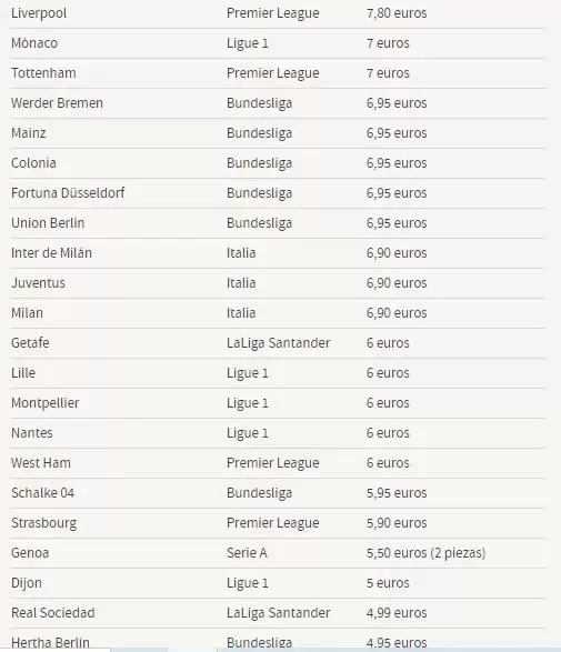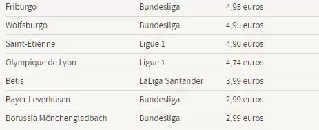 En el otro extremo hay 2 equipos alemanes, el Borussia Mönchengladbach y el Bayer Leverkusen, a los que se los puede adquirir por 2.99 euros. La Bundesliga fue la primera en retomar las actividades.