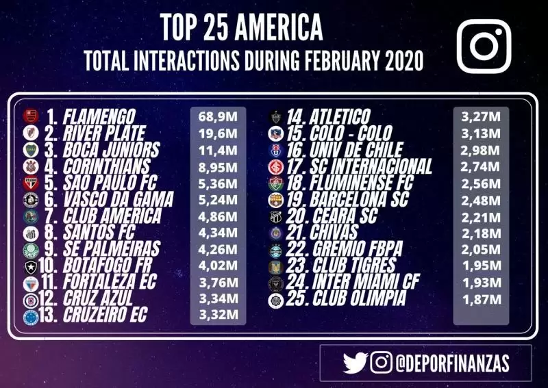 Los equipos brasileños lideran el ranking de los equipos con más interacciones en Instagram durante el mes de febrero de 2020. Siete de los diez primeros equipos son de ese país, al igual que 13 de los 25.