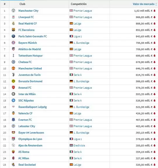 En cuanto a esto, el Manchester City es el equipo que más se ha devaluado, seguido por el Barcelona y el Bayern Múnich. El equipo inglés ha perdido casi 250 millones de euros y registrado una caída del 19.7%. Pese a esto, es el único club del mundo cuyo valor de mercado sigue superando la marca de los 1.000 millones de euros. En concreto, 1.018 millones de euros.