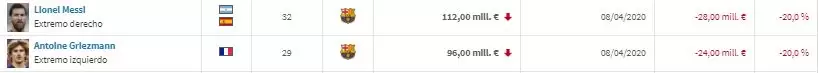 Lionel Messi, a partir de esto pasó de tener un valor de mercado de 140 millones de euros a 112 millones, es decir una diferencia de 28 millones y un significativo 20%. El caso de Antoine Griezmann es el mismo, de un valor anterior de 120 millones, pasó a 96 millones y una diferencia de 24 millones.