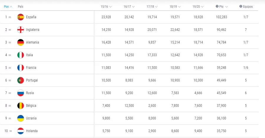Puede parecer raro que los españoles se ubiquen en la cima si se toma como referencia los resultados de la UEFA Champions League, ya que ninguno llegó a instancias de semifinales. Real Madrid quedó eliminado en Octavos, mientras que Barcelona en Cuartos de Final. Es por eso que el campeonato logrado por Sevilla en la UEFA Europa League tomó mayor relevancia y pasó a ser determinante para que LaLiga conserve el primer puesto.