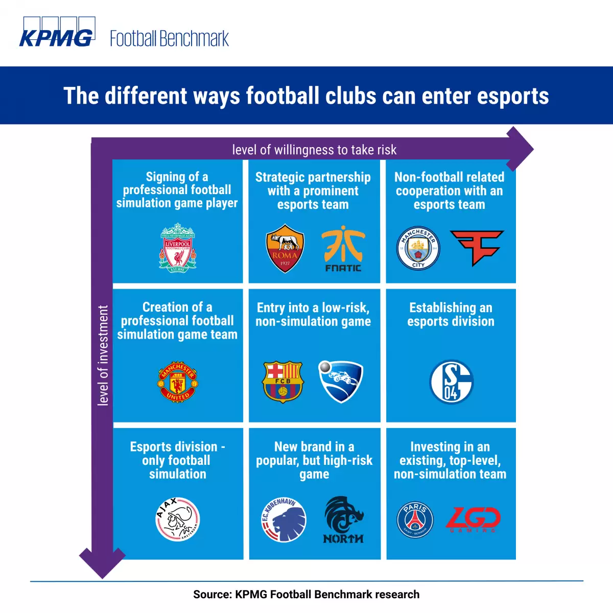 En el caso de la Roma y Manchester City, estos dos clubes se asociaron con equipos ya creados de esports, con los cuales crearon una estrategia de cooperación. El caso del Barcelona es distinto, su ingreso se dio con cierto temor por parte del club, ya que lo hizo creando un equipo para formar parte de las competencias de Rocket League, un juego que no tiene el mismo pesos que los anteriormente mencionados. Mientras que el Paris Saint-Germain, lo hizo invirtiendo en un equipo ya existente y de importante nivel, como lo es LGD Gaming.