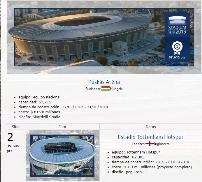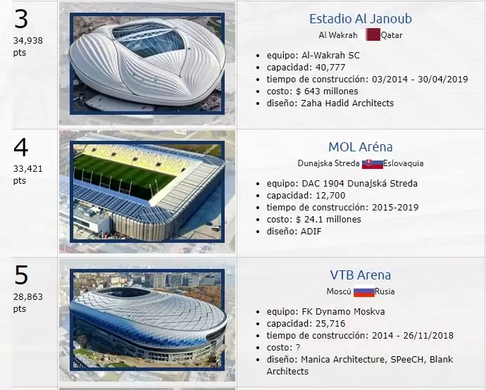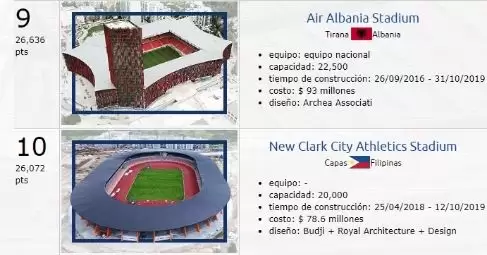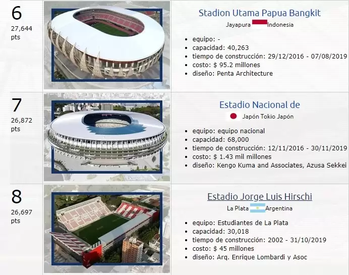 Por delante del estadio de 1 y 57 quedaron ubicados: Puskás Aréna (Budapest, Hungría), Tottenham Hotspur Stadium (Londres, Inglaterra), Al Janoub (Al Wakrah, Qatar), MOL Arena (Dunajska Streda, Eslovaquia), VTB Arena (Moscú, Rusia), Stadion Utama Papua Bangkit (Jayapura, Indonesia) y Estadio Nacional de Japón (Tokio, Japón).