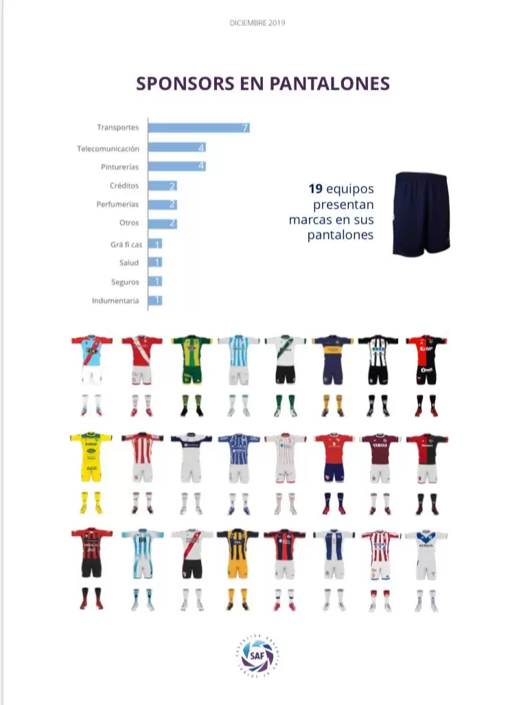 Por último, repasamos los sponsors en los pantalones, una nueva tendencia que ha empezado a rendir sus frutos, y de los “más grandes” a los “más chicos” cuenta con 19 de los 24 equipos usando dicho espacio para el branding. De los 19, siete corresponden a transporte, cuatro a telecomunicaciones, cuatro a pinturerías, dos a créditos, dos a perfumerías, dos a “otros”, uno a gráficas, uno a salud, uno a seguros y uno a indumentaria.