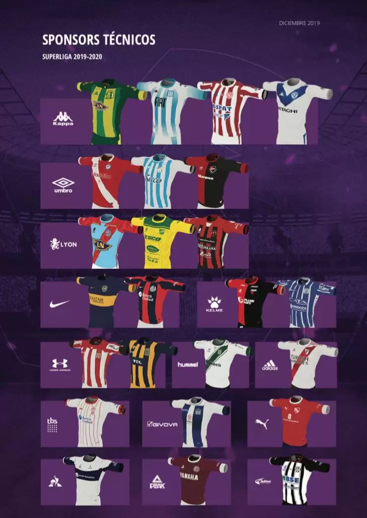 En primer lugar, aparecen los sponsors técnicos, con Kappa en la cima de la lista al vestir a cuatro de los equipos del torneo (Aldosivi, Racing, Unión y Vélez), Umbro figura segundo con tres (Argentinos Juniors, Atlético Tucumán y Newell’s), al igual que Sport Lyon con tres (Arsenal, Defensa y Justicia y Patronato); Kelme (Colón y Godoy Cruz), adidas (River y Boca), Under Armour (Rosario Central y Estudiantes de La Plata) y Givova (Banfield y Talleres) cuentan con dos equipos vestidos cada uno, mientras que Nike (San Lorenzo), TBS (Huracán), PUMA (Independiente), Le Coq Sportif (Gimnasia La Plata) Adhoc (Central Córdoba) y Peak (Lanús) visten a uno solo cada uno.