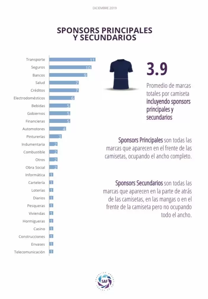 Pasando a sponsors secundarios e ubicados en otras partes de las camisetas, es el rubro de transporte el que lidera la tabla con un total de 11, seguido por seguros (10), bancos (9), salud y créditos con 7 y muchos más.