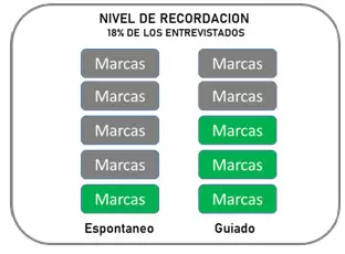 Se les indicaba a los individuos un determinado evento emitido en un lapso de 48hs antes. y debiendo pelar solo a la memoria evocativa, solo el 18 % de estos. Reconocían de manera espontánea una cantidad de marcas cuya proporción es de una cada cinco marcas, mientras que de manera guiada esta cifra ascendía a tres sobre cinco marcas expuestas en el mismo evento.