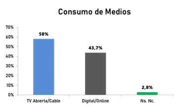 Por los medios donde los individuos abordan información deportiva, hay un gran avance de lo digital sobre los medios convencionales, esto significa que la televisión casi exclusivamente mediante las señales de cable alcanza un 58% vs el 43,7% del consumo de los medios digitales, el dato del consumo de medios gráficos está comprendido dentro del porcentaje de participación de los medios digitales, un dato significante es el 2,8 % de aquellos individuos que no identifican concretamente por donde consumen este tipo de información.
