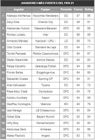 El top 10 lo completan: Obbi Oularé de Sandard, Tomas Petrasek de Rakow Czestochowa, Stefan Maierhofer de Admira Wacker, Felipe Carvalho de Valeranga y Florian Ballas de Erzgebirge Aue, Sebastián Coates de Sporting Lisboa, Ariel Nahuelpán de Querétaro, Pape Abou Cissé de Olympiacos, Kalidou Koulibaly de Napoli y Geoffrey Kondogbia de Valencia, todos con un valor de 94 puntos. Llamativamente, el jugador argentino más fuerte del FIFA 21 es Nahuelpán.