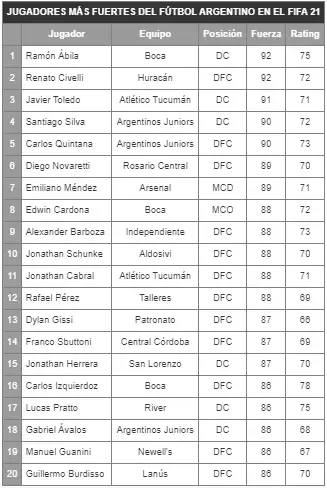 En el fútbol argentino, el más destacado dentro de este rubro es Ramón Ábila (Boca Juniors) con una puntuación de 92, al igual que Renato Civelli, de Huracán. El podio, con 91, lo completa el delantero de Atlético Tucumán, Javier Toledo.