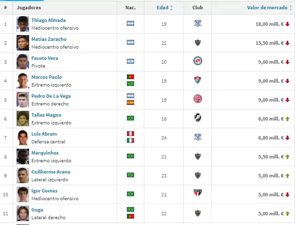 Como se puede ver en el gráfico, los 3 primeros lugares del listado están ocupados por mayoría de jugadores argentinos. La primera posición es del joven Thiago Almada (Vélez) con un valor de 18 millones de euros, seguido muy de cerca por Matías Zaracho (Atlético Mineiro) con 15.5 millones. Un poco más relegados pero dentro del podio quedaron Fausto Vera (Argentinos Juniors), Pedro de la Vega (Lanús) y el brasileño Marcos Paulo (Fluminense), todos con 9 millones de euros. En el resto del ranking son todos futbolistas de Brasil, con la excepción del peruano Luis Abram.