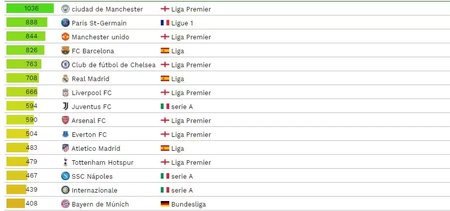 El Paris Saint-Germain y el Manchester United completaron el podio, según el estudio realizado por el Observatorio de Fútbol CIES. Respecto al año anterior, el City produjo una suba de 22 millones de euros en su valoración, aunque el incremento del United fue de 93 millones. El valor de los “Diablos Rojos” fue de 844 millones de euros.