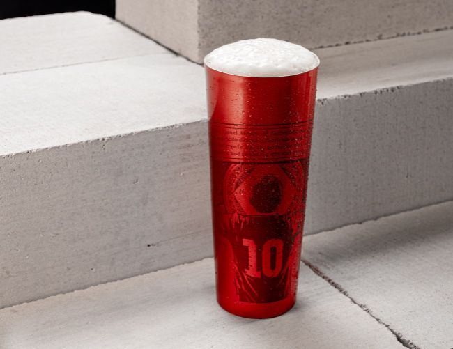De aluminio anodizado en su cara interna y transparente en el exterior, el vaso muestra la imagen de Leo con los brazos al cielo y el 10 (diez) en la espalda. Tiene los colores característicos de Budweiser, rojo y azul, pintado con pintura orgánica libre de metales pesados e impreso en serigrafía, lo que lo convierte en una pieza única, de colección.