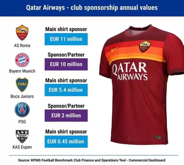 La aerolínea de Medio Oriente se luce en las camisetas de la Roma, Boca Juniors y KAS Eupen de Bélgica. Pero también es patrocinador del Bayern Múnich y del Paris Saint-Germain. En el caso del equipo italiano, la aerolínea tiene contrato hasta el fin de la temporada 2020/21 y el club ingresa 11 millones por temporada.