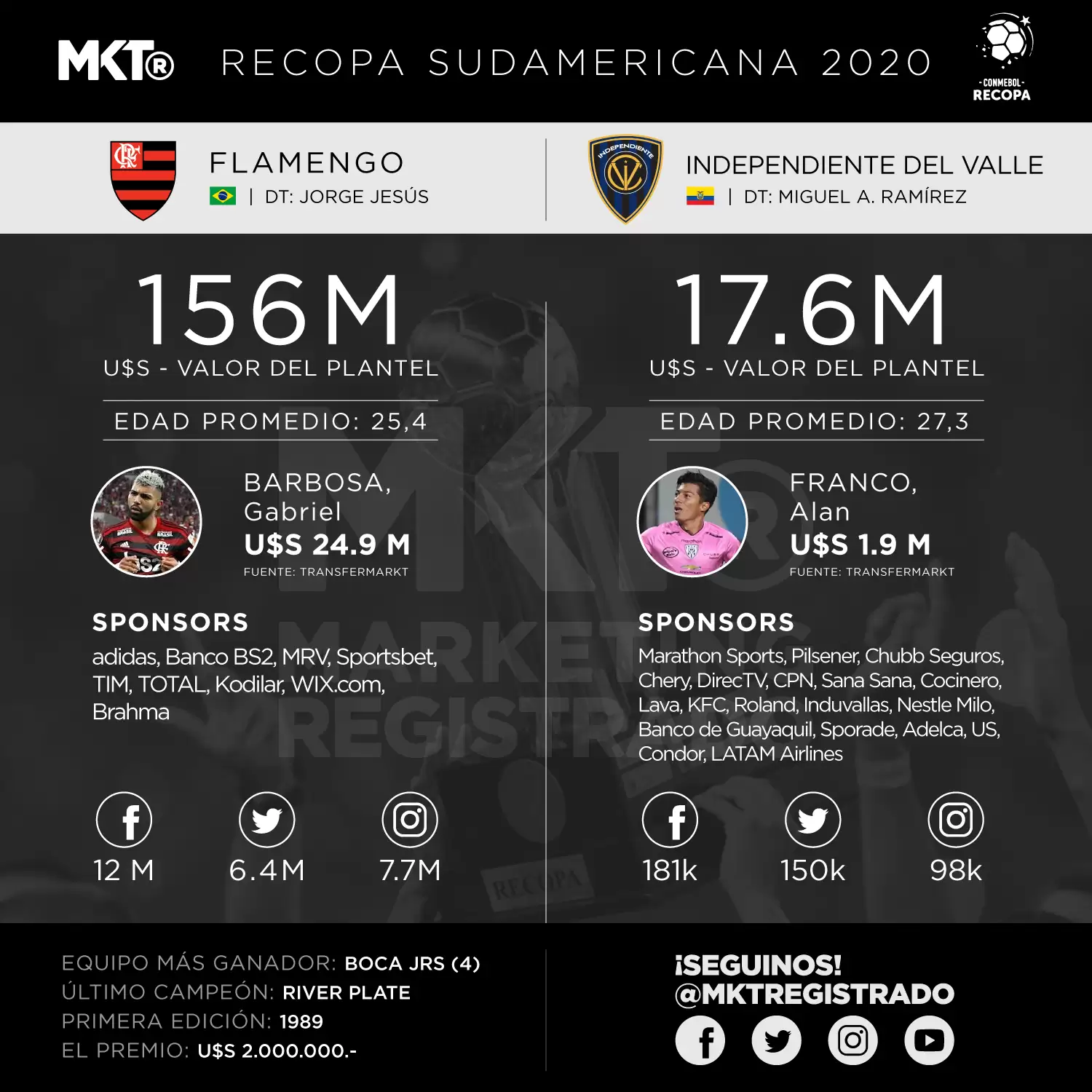 Flamengo es sin lugar a duda en cuanto a números el gran candidato a quedarse con el primer título de la CONMEBOL de la temporada. Su importante poderío en la cancha se traduce en las grandes cifras que se manejan en cuanto al valor del plantel. Según el sitio Transfermarkt, especializado en valoración de jugadores y planteles, el equipo carioca tiene un plantel valuado en 156 millones de dólares, mientras que el del equipo ecuatoriano solo es de 17.6 millones de dólares.