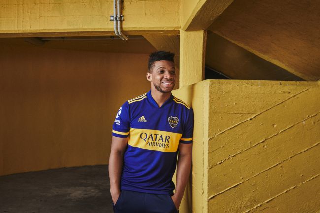 La camiseta titular presenta la tradicional franja amarilla horizontal sobre fondo azul. Las tres tiras de la marca aparecen en amarillo sobre los hombros, y las mangas forman la tradicional bandera Xeneize. Este kit se completa con short y medias azules.