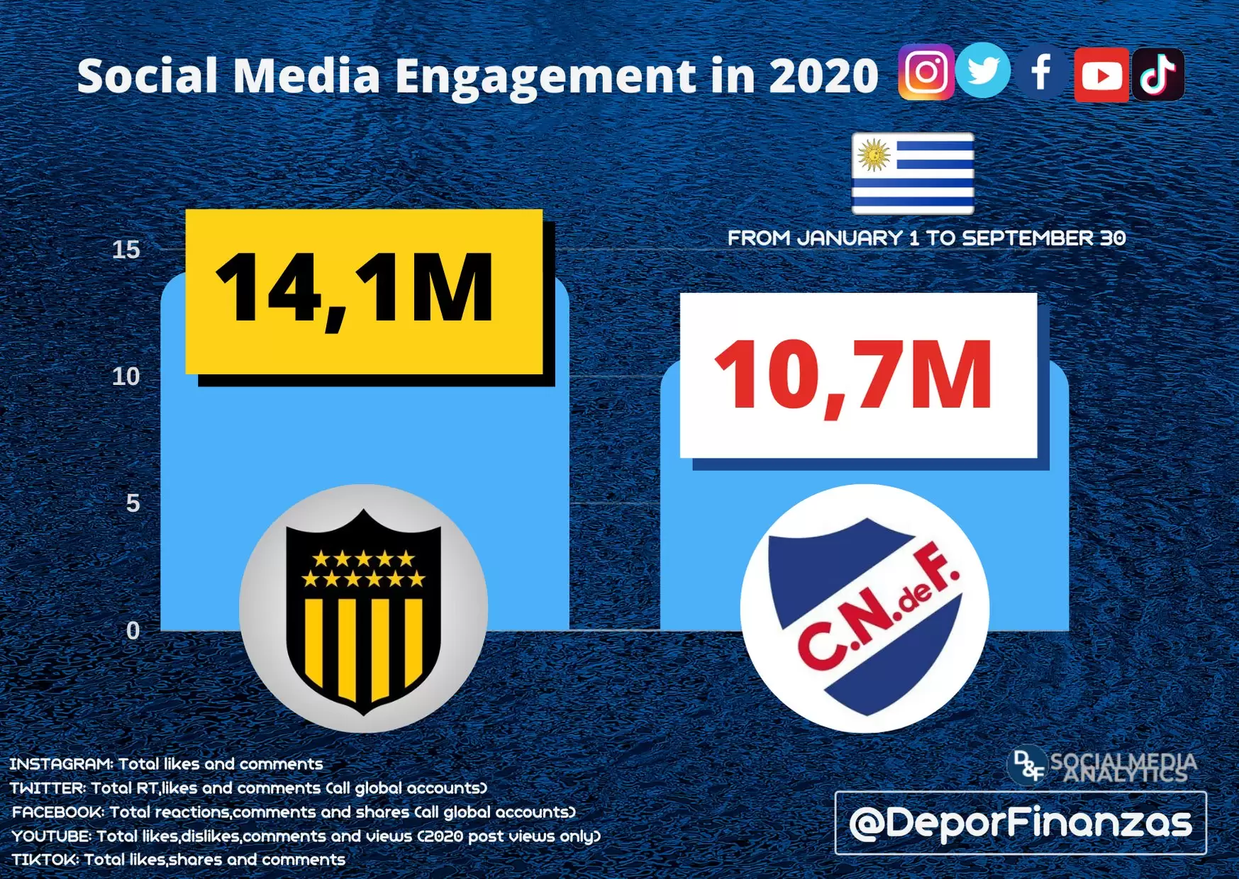 En lo que va del 2020, Peñarol fue el que más se destacó en las distintas plataformas. En total suma 14.1 millones de interacciones entre Instagram, Twitter, Facebook, Tik Tok y YouTube, sobre los 10.7 millones de Nacional. Las fechas que tomó el sitio Deportes & Finanzas para hacer el análisis van del 1 de enero al 30 de septiembre.