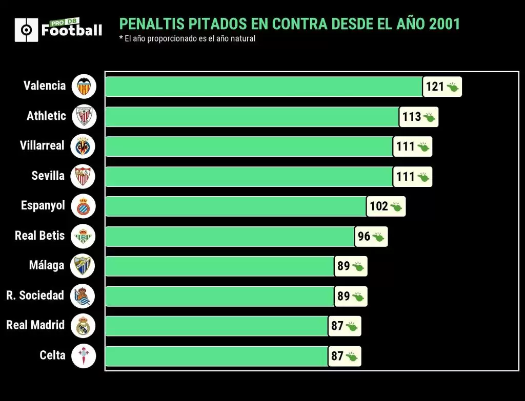 El Sevilla y el Athletic Bilbao son los 2 equipos que más se acercan, con 133 y 127, respectivamente. El “Top Ten” de equipos a los que más penales les han cobrado en lo que va del Siglo XXI son: Atlético de Madrid (113), Valencia (112), Villarreal (108), Espanyol (93), Real Sociedad y Betis (81).