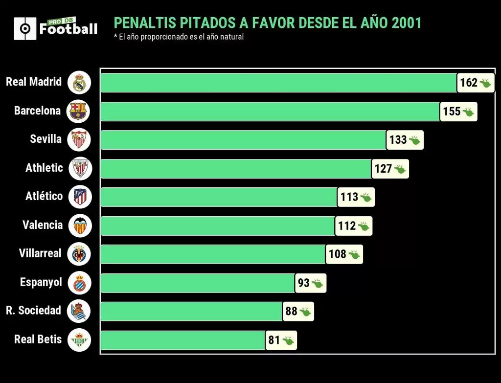 Esa es una discusión que nunca acabará. Pero en LaLiga de España, hay 2 equipos que son más beneficiados que otros. Se tratan del Barcelona y el Real Madrid. Según un estudio llevado a cabo por el sitio ProFootballDB, estos equipos son los que más penales a favor han tenido en estos años.