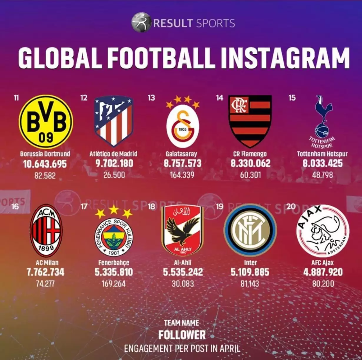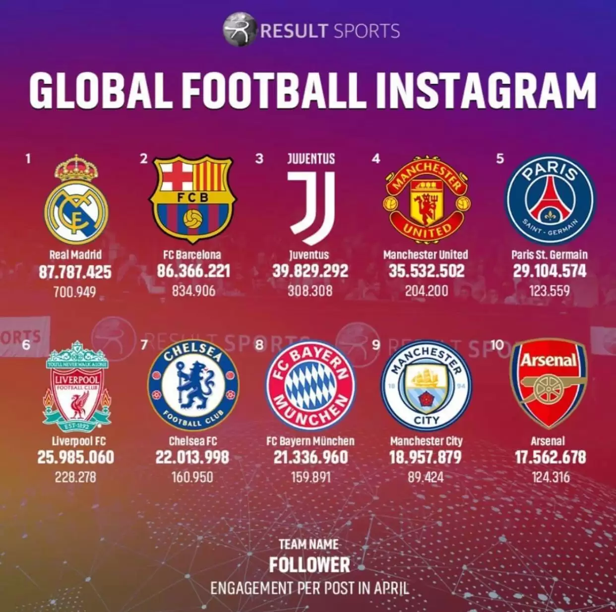 El ranking de los 20 equipos con más seguidores en Instagram en abril que publicó Result Sports también muestra las interacciones de cada club.