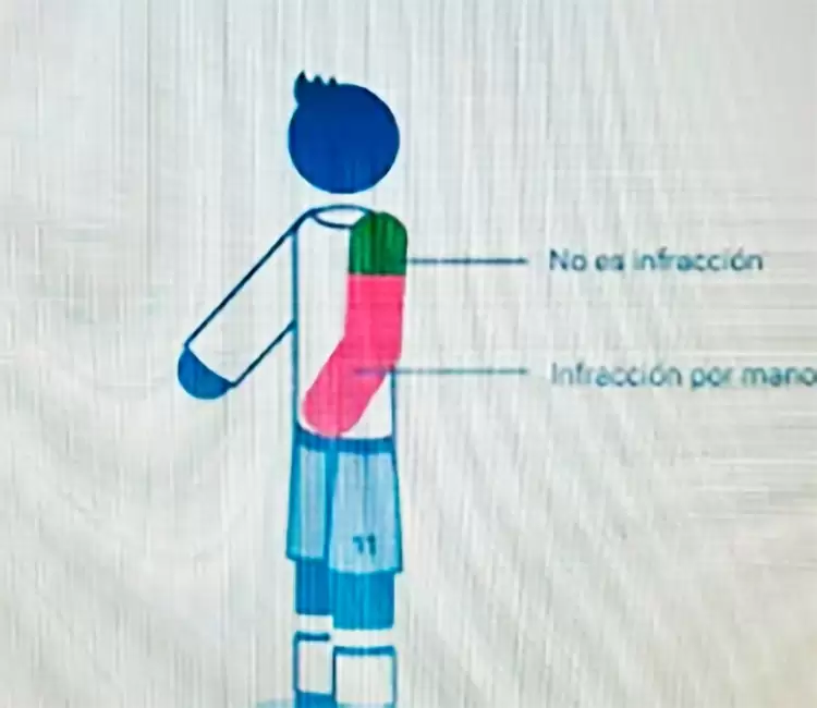 ¿Qué parte del brazo se considerará para una infracción? Se considerará cuando el balón impacte en el brazo a partir de la altura de la axila. De ahí para arriba no habrá sanción, de ahí para abajo, sí.
