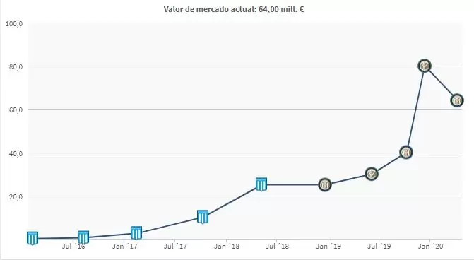 Por el otro lado, Lautaro Martínez es la joya que todo equipo en Europa desea tener por estos tiempos. Pretendido por el Barcelona, el argentino está cerca de conseguir su primer título con el Inter, equipo que lo catapultó a las primeras planas. El “Toro”, que lleva ya 2 temporadas en el “Nerazzurri”, tiene un valor de mercado actual de 64 millones de euros, aunque su mayor cifra la consiguió antes de la crisis generada por el COVID-19. En diciembre de 2019 llegó a estar valuado en 80 millones.