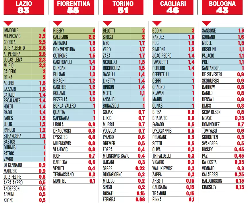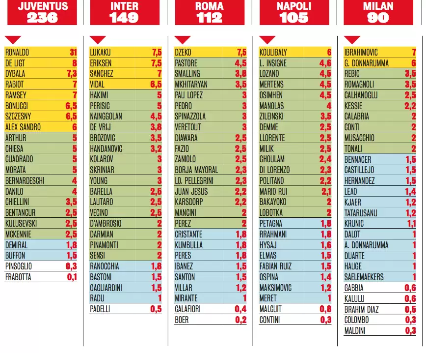 A grandes rasgos queda reflejado el dominio absoluto de Juventus sobre el resto. De esta manera se puede entender mejor los 9 Scudettos consecutivos que levantó el equipo. Los de Turín tiene un plantel que cobra 236 millones de euros, por delante de Inter (149), Roma (112) y Napoli (105). Del resto, sólo 2 superan los 55 millones: Milan (90) y Lazio (83).