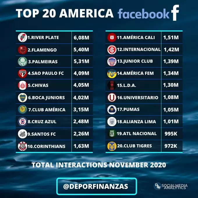 River Plate se convirtió en el equipo sudamericano más popular en Facebook a lo largo de noviembre y logró así algo que parecía impensado de acuerdo a las estadísticas de todo el año. En relación a los estudio que fue revelando el sitio Deporte & Finanzas durante 2020, Flamengo siempre se había posicionado como el club con más interacciones en las redes sociales, con un claro dominio en Facebook.