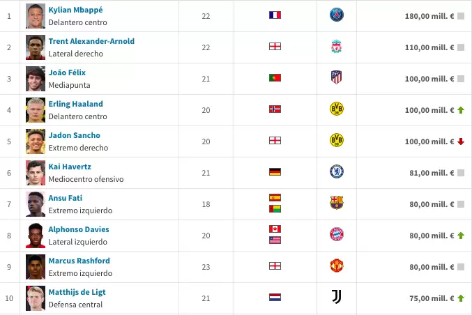 A continuación, de la mano de los datos del sitio Transfermarkt, conocemos cuáles son los 10 jugadores Sub 23 de mayor valoración en el mercado.